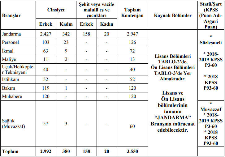 Jandarma subay alımında branşlar ve KPSS şartı şu şekilde;