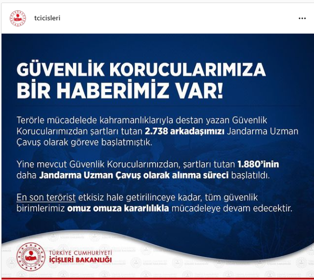 İçişleri Bakanlığı tarafındna geçtiğimiz gün yapılan açıklamada 2 bin 738 korucunun uzman çavuş olmaya hak kazandığına yer verildi. Resmi duyuru şu şekilde: