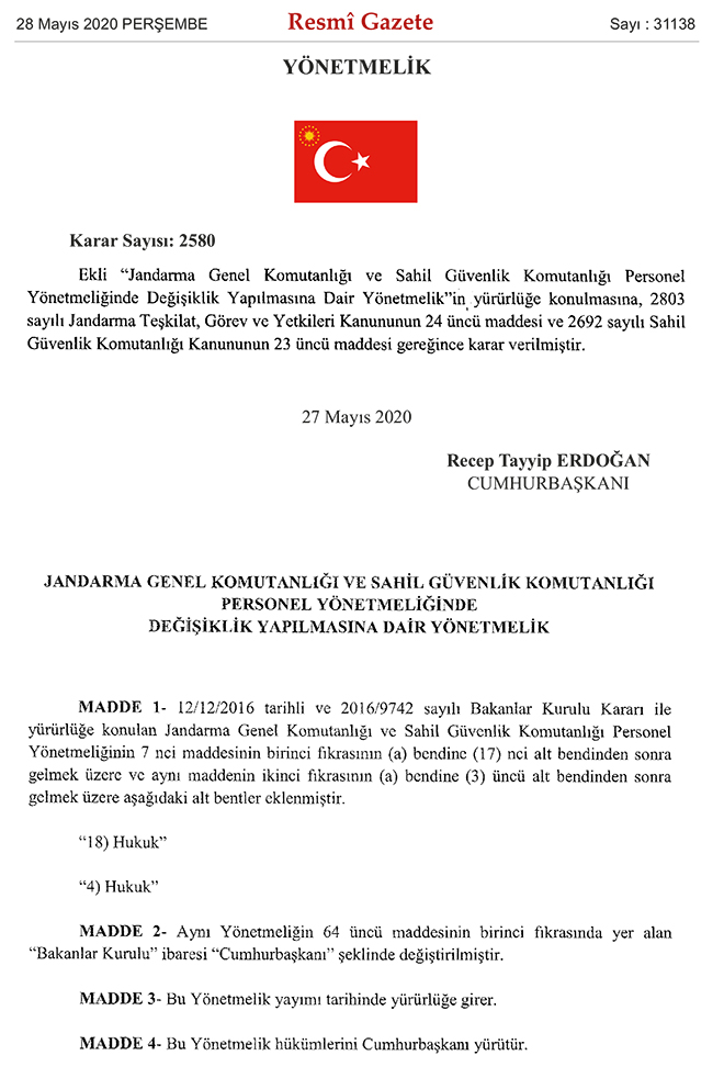 Resmi Gazete 'nin 28 Mayıs 2020 tarihli sayısında önemli bir karar yayımlandı. Yayımlanan kararda Jandarma Genel Komutanlığı ile Sahil Güvenlik Komutanlığı bünyesine yeni branş açıldığına yer verildi.