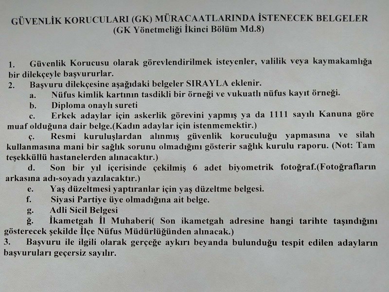 İlana başvurular aşağıdaki evraklarla birlikte ilçe jandarmaya yapılacak.