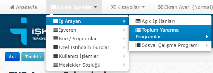 Online işlemler kısmına tıkladığınızda yukarıdaki gibi önce iş arayan linkine tıklayın ve daha sonra Toplum Yararına Programlar linkine tıklayın başvuru sayfasına gidin.