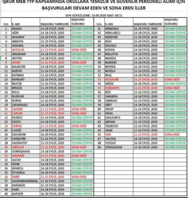 İŞKUR üzerinden yayımlanan güncel personel alımı ilanlarına baktığımızda, şimdiye kadar 69 şehre personel alımı yapıldığı görüldü. İşte alım yapılan şehirler ve başvuru tarihleri: