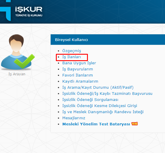 Yukarıdaki linke tıklayın. Açılan sayfada iş arayan yazan kısımdan giriş yapın. Giriş yaptıktan sonra aşağıdaki ekran karşınıza çıkacak.