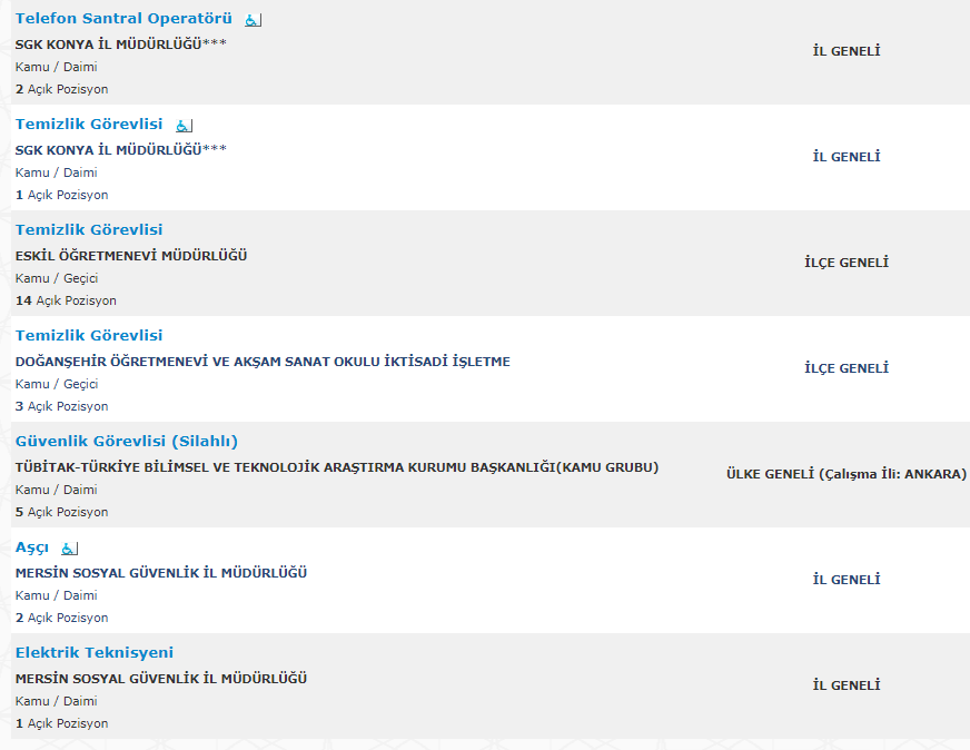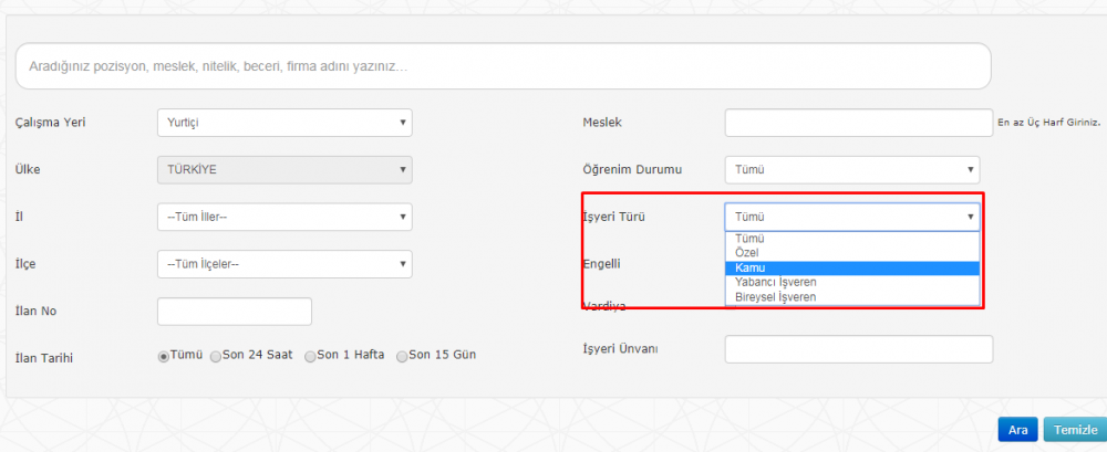 Bu ekranda da İŞYERİ TÜRÜ yazan kısımda KAMU seçeneğini tıklayın ve ARA butonuna tıklayın. İlanlar aşağıda sıralanacaktır.