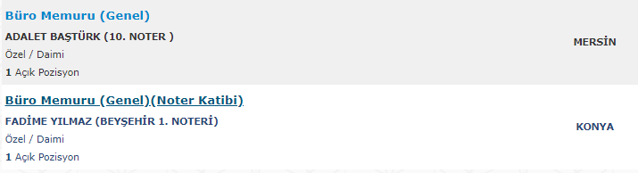 İki şehirdeki noterlere yapılan büro memuru alımında adaylar , katip olarak istihdam edilecek. İlanlara baktığımızda Mersin 'de bulunan 10 'uncu noterliğe ve Konya Beyşehir'de bulunan 1 'inci noterliğe personel alımı yapıldığı görüldü.