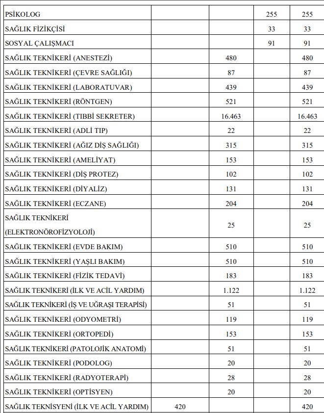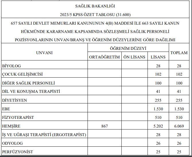 28 Mart 2023 Tarihli ve 32146 Sayılı Resmî Gazete'de yayımlanan alım ilanına göre Sağlık Bakanlığı taşra teşkilatı hizmet birimlerinde istihdam edilmek üzere 31.600 sözleşmeli sağlık personeli alımı yapılacak.