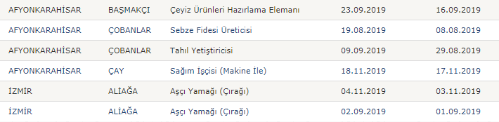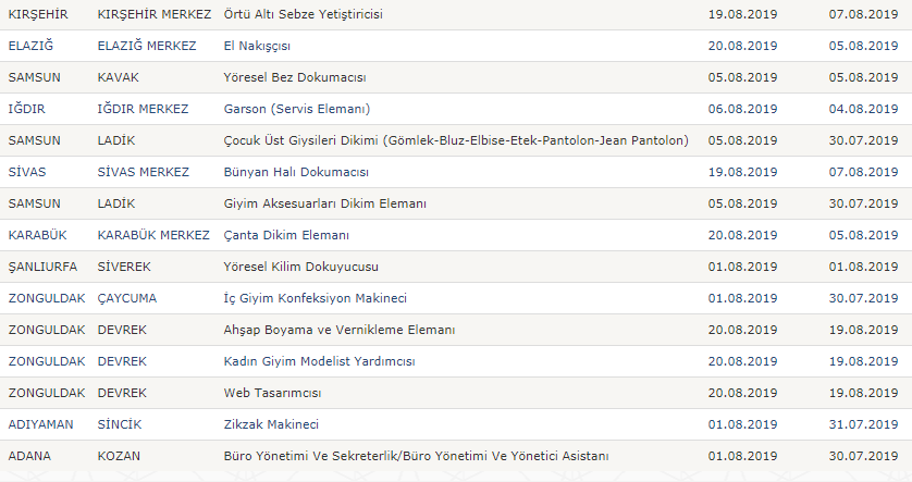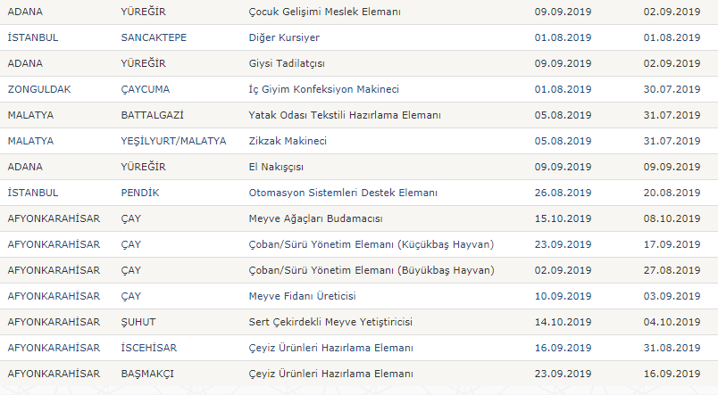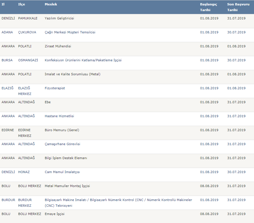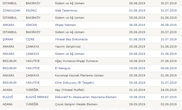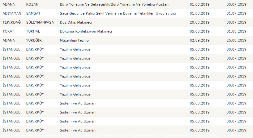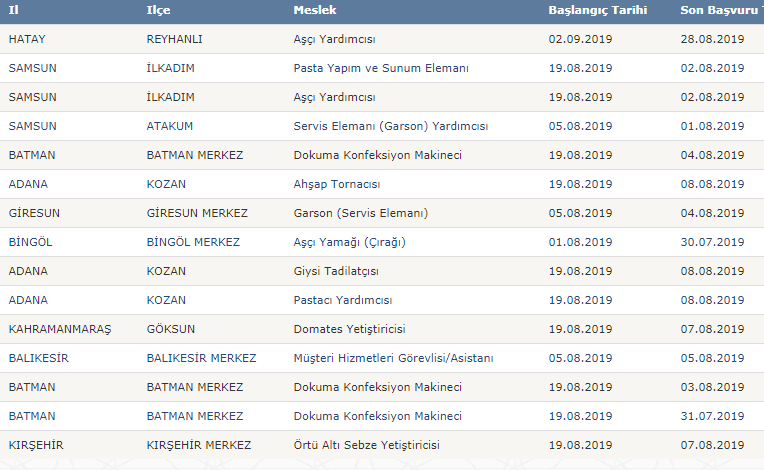 Türkiye İş Kurumu resmi internet sayfasında yayımlanan işbaşı ve mesleki eğitim kursu güncel ilanları şu şekilde;