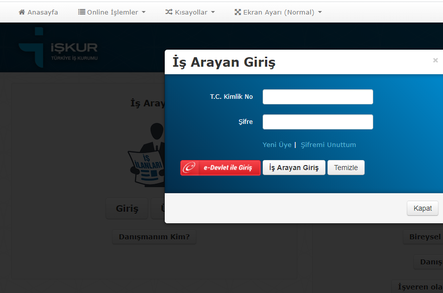 2. Açılan sayfada, aşağıdaki gibi İŞ ARAYAN kısmından giriş yapın.