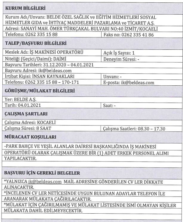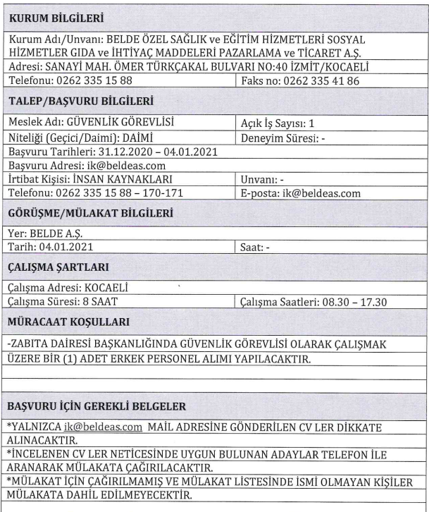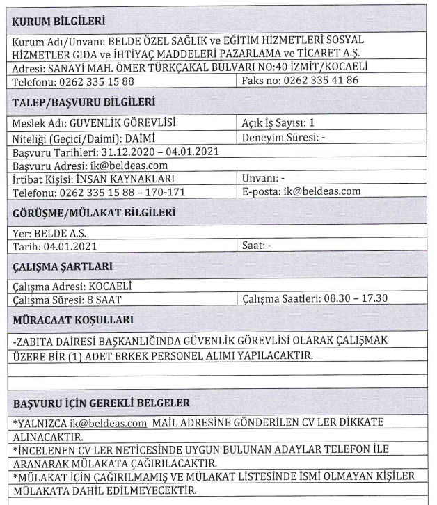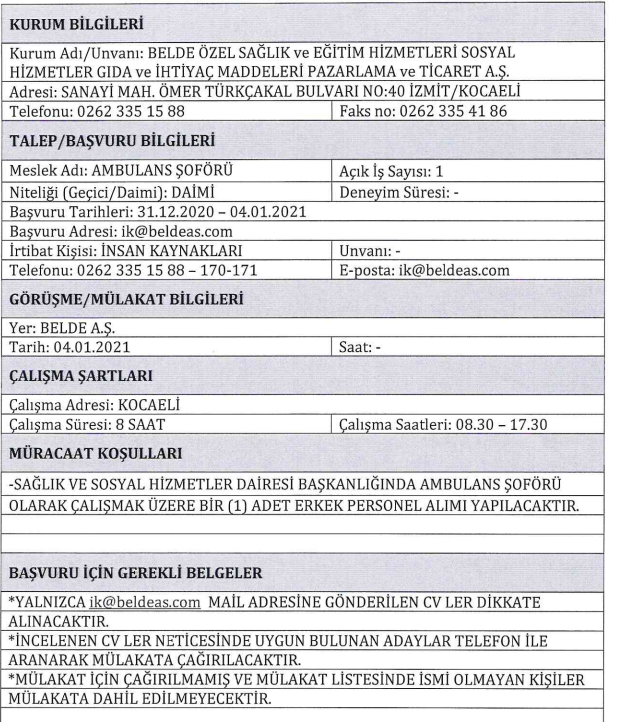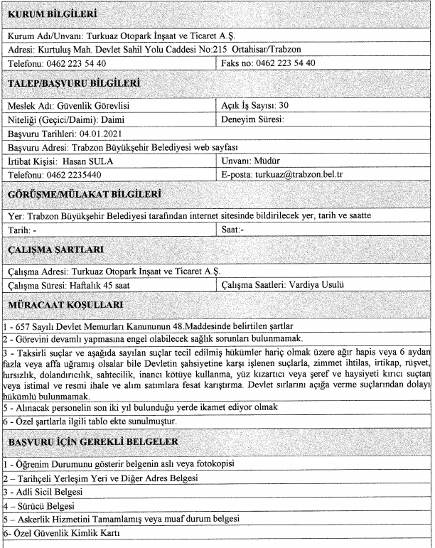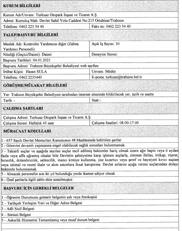 İŞKUR üzerinden duyurular yayımlandı. Yayımlanan duyurularda en az ilkokul mezunu adaylar arasından KPSS puan şartı aranmadan personel alımı yapılacağına yer verildi. 7 şehirde ambulans sürücüsü, güvenlik görevlisi, büro personeli, yardımcı zabıta personeli, ulaşım personeli, şoför, kontrolör ve yardımcısı, iş makinesi operatörü ile teknisyen kadrolarına yapılan alımların detayları yazımızda.