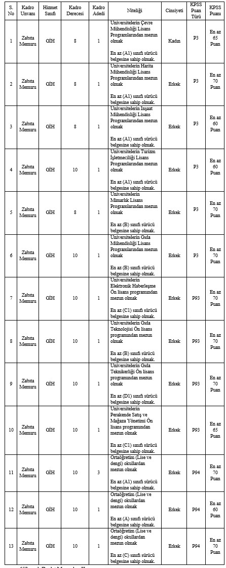 - İlan edilen zabıta memuru kadroları için, mezun olunan okul itibariyle öğrenim şartını taşımak ve bu öğrenimle ilgili olarak 2022 yılı Kamu Personel Seçme Sınavından (KPSS) alım yapılacak unvanların karşısında belirtilen puan türlerinden, belirtilen asgari KPSS puanını almış olmak,