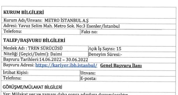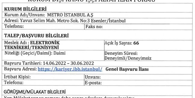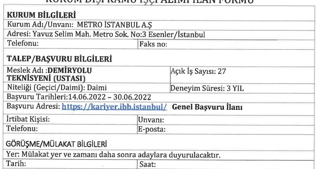 İstanbul Büyükşehir Belediyesi şirketlerinden olan İstanbul metro A.ş bünyesinde farklı mesleklerden istihdam etmek üzere 127 personel alımı yapacağını duyurdu.. İşte alım yapılacak meslekler..