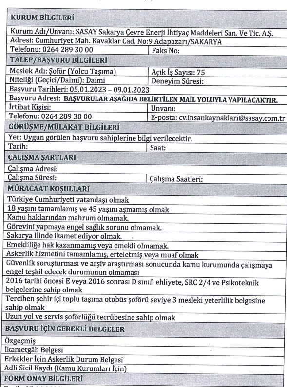 Yeni yıl ile birlikte belediyeler ve şirketleri personel alımlarına başladı. İŞKUR kurum dışı işçi alımı ekranı üzerinden yayımlanan ilan göre Sakarya Büyükşehir Belediyesi şirketi SASAY, Sakarya Çevre Enerji İht. Mad. San. ve Tic. A.Ş şoför pozisyonunda bünyesine 75 personel alımı yapacak.