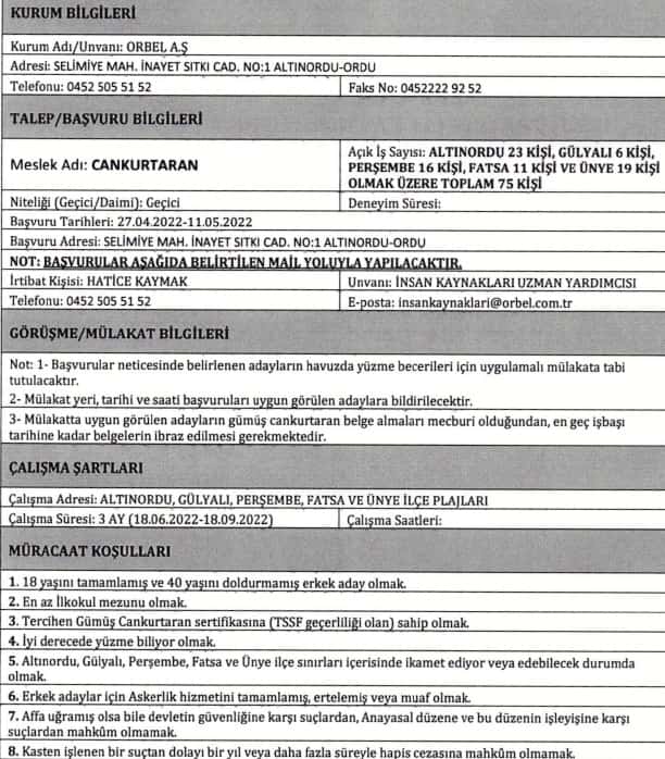 Açıklanan İşçi alımı ilanı kamu personeli alımı duyurusu ile birlikte Ordu Belediyesi Orbel birimlerinde çalıştırılmak üzere cankurtaran alımı yapılacağı bildirildi.