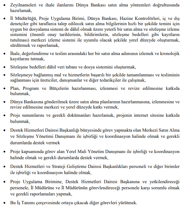 "Proje kapsamında, İstanbul, Adana, Gaziantep ve Şanlıurfa Çalışma ve İş Kurumu İl Müdürlüklerine, ihtiyaç duyulan tüm satın alma ve sözleşmelerin uygulanmasına yönelik faaliyetleri yürütmek, gerekli koordinasyon ve desteği sağlanmak ve teknik danışmanlık sunmak üzere 1 Yerel Satın Alma ve Sözleşme Yönetimi Danışmanının görev almasına ihtiyaç duyulmaktadır."