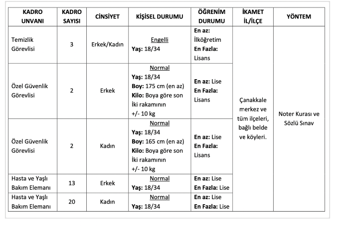 Çanakkale Onsekiz Mart Üniversitesi’nce yayımlanan duyuruda kuruma 40 personel alımı yapılacağı, başvuru yapacak adaylarda engelli temizlik görevlisi alımı için en az ilkokul mezuniyeti aranırken, özel güvenlik görevlilerinde en az lise, hasta ve yaşlı bakım elemanı alımında da en az lise şartı aranıyor.