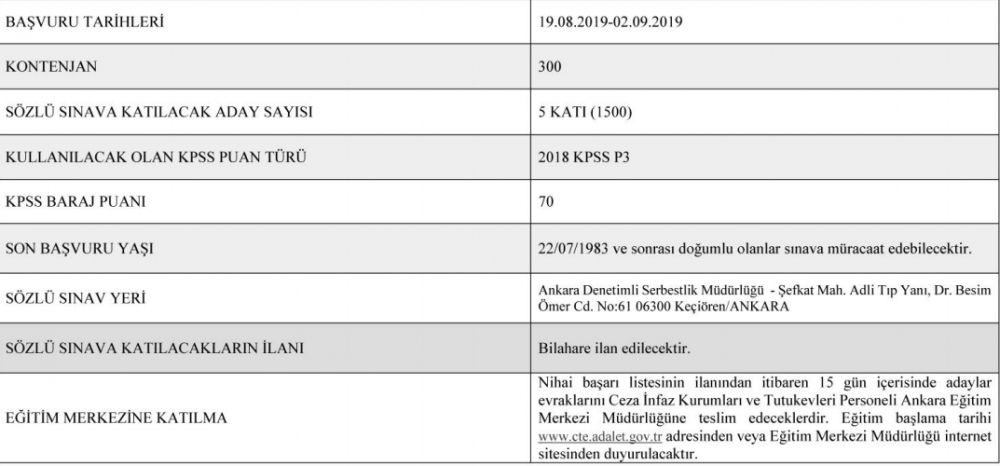 Ceza ve Tevkifevleri Genel Müdürlüğü yeni ilan yayımladı. Yayımlanan ilanda , idare memuru olarak yetiştirmek üzere personel alımı yapılacağına yer verildi. 300 memur alımı için yayımlanan ilan , başvuru şartları ve başvuru tarihleri haberimizde.