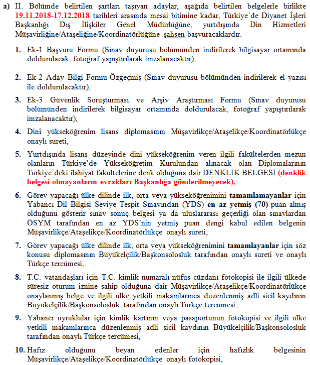 Diyanet tarafından yayımlanan ilan için başvuru şartları şu şekilde;