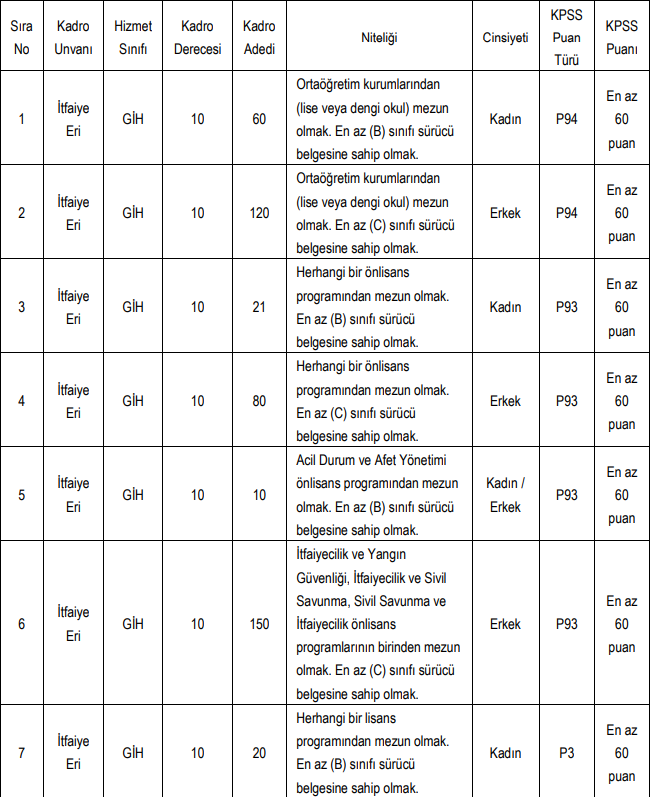 İlan edilen İtfaiye Eri kadrolarına atanmak için