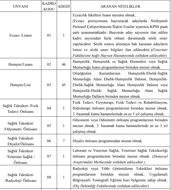 657 sayılı Kanunun 4/B maddesi uyarınca, Üniversite Hastanesi, Diş Hekimliği Fakültesi, Veteriner Fakültesine bağlı Hayvan Hastanesi ve Deneysel Araştırmalar Merkezinde görevlendirilmek üzere yapılacak sözleşmeli kamu personeli alımında başvuru bilgileri şu şekilde: