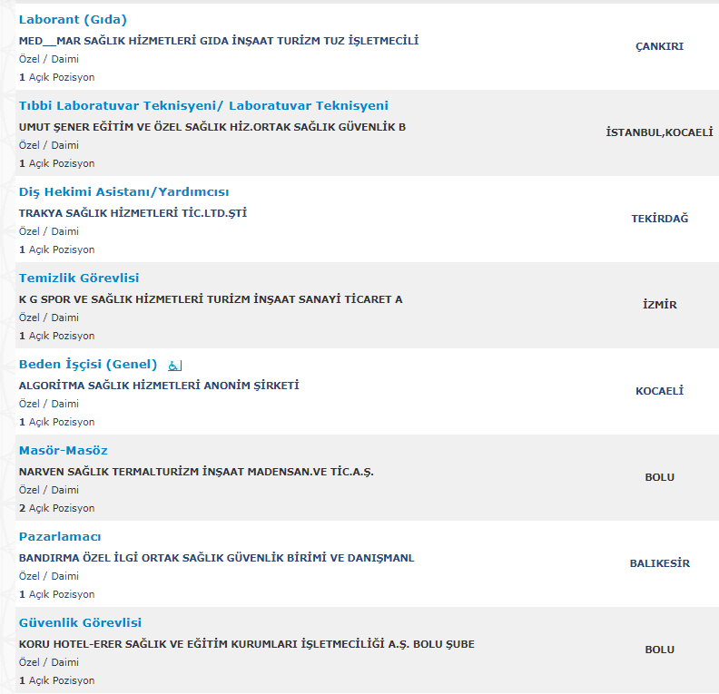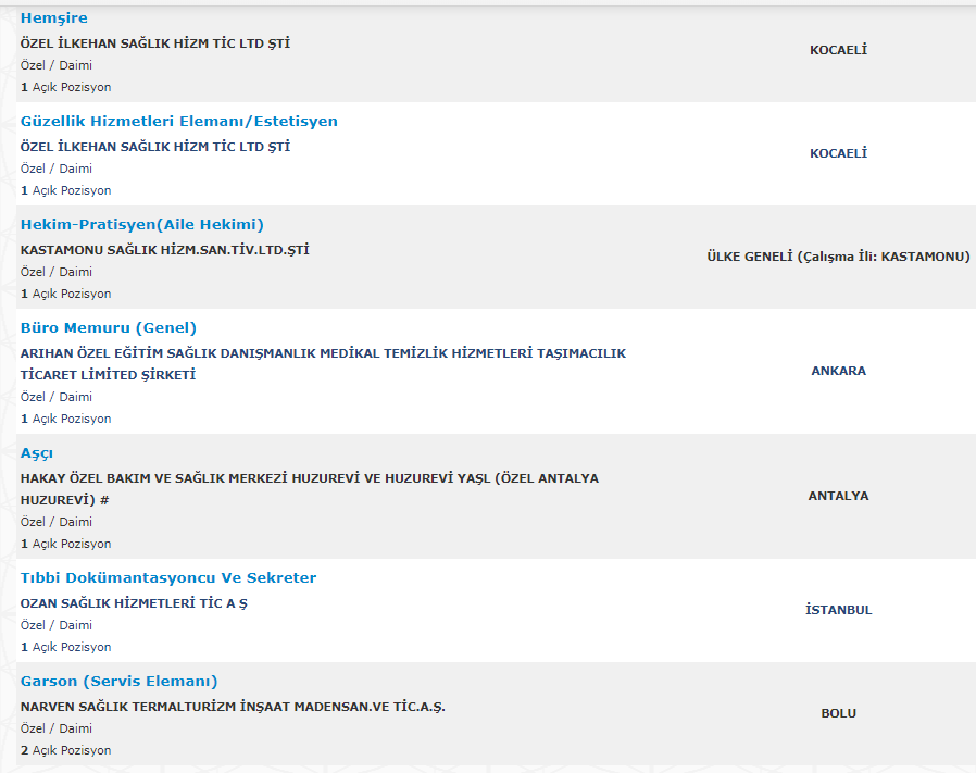 Türkiye İş Kurumu internet sayfası aracılığıyla hastanelere ve sağlık kuruluşlarına yapılan personel alımları şu şekilde;