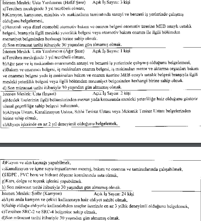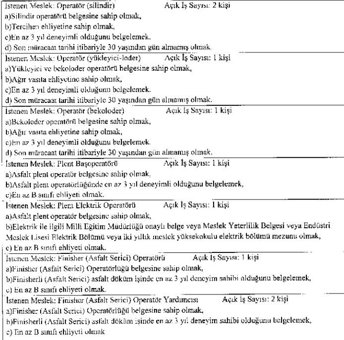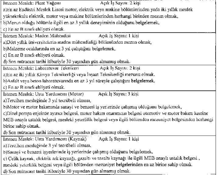 Operatör, başoperatör, operatör yağcısı, maden mühendisi, laboratuvar teknikeri, plent yağcısı, usta yardımcısı, şoför, güvenlik görevlisi, bina ve mal bakımcısı, temizlik işçisi ve beden işçisi kadrosuna personel alımı yapılacak.