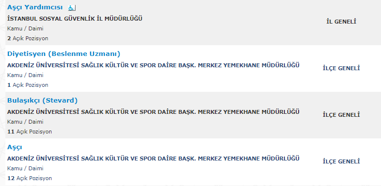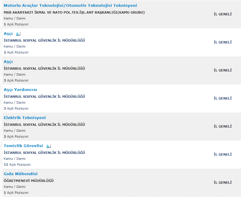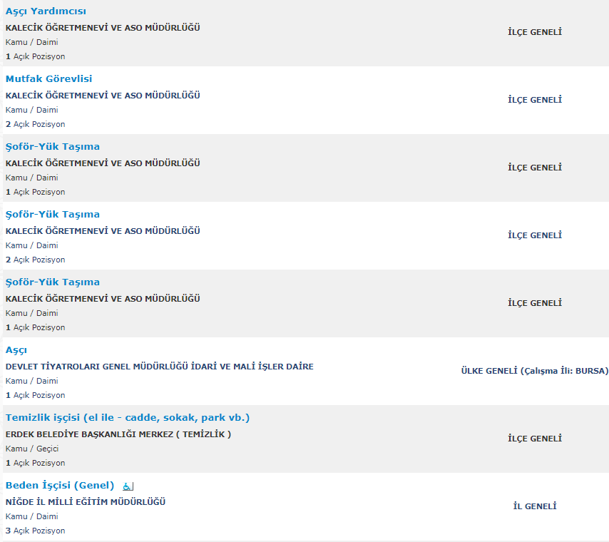Türkiye İş Kurumu resmi sayfası kamu ilanları kısmında bugün ilanlar yayımlandı. Yayımlanan ilanlarda MEB, TCDD, MSB, SGK, Devlet Tiyatroları ile Üniversite , kamu personeli ve kamu işçisi alımı yapıyor.