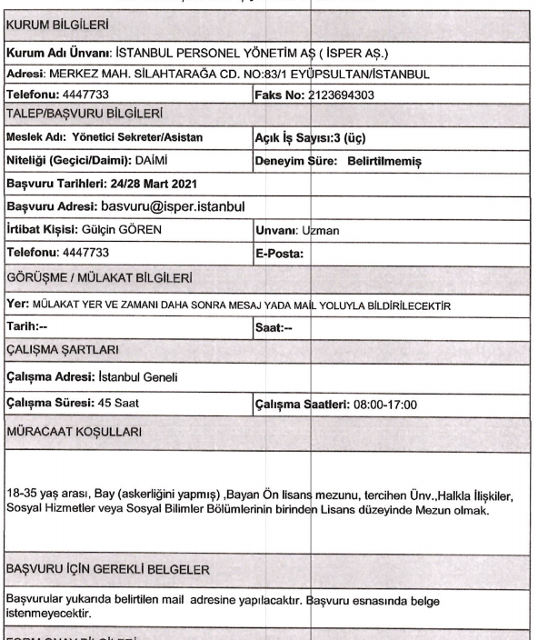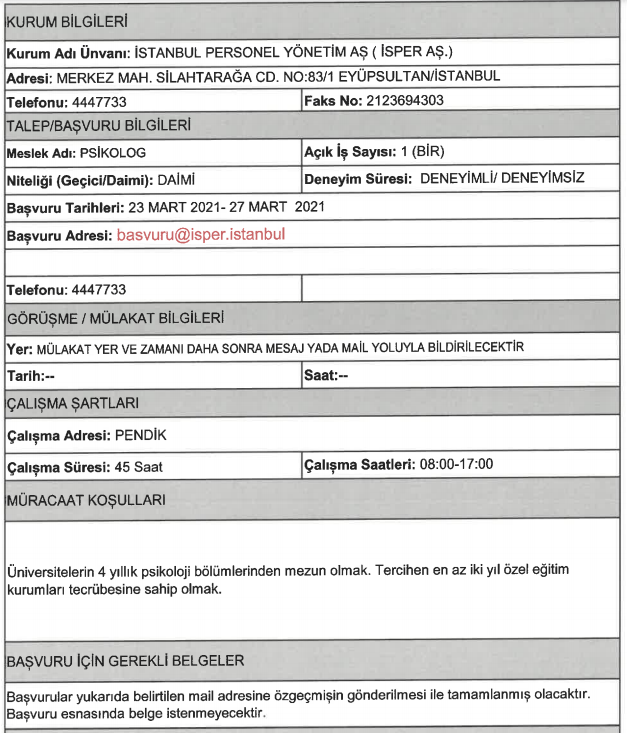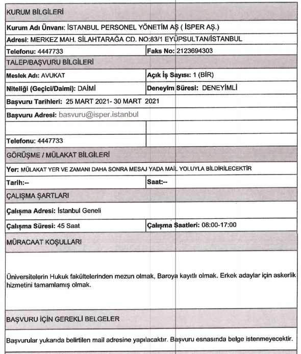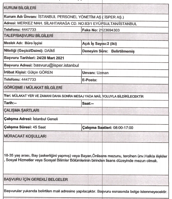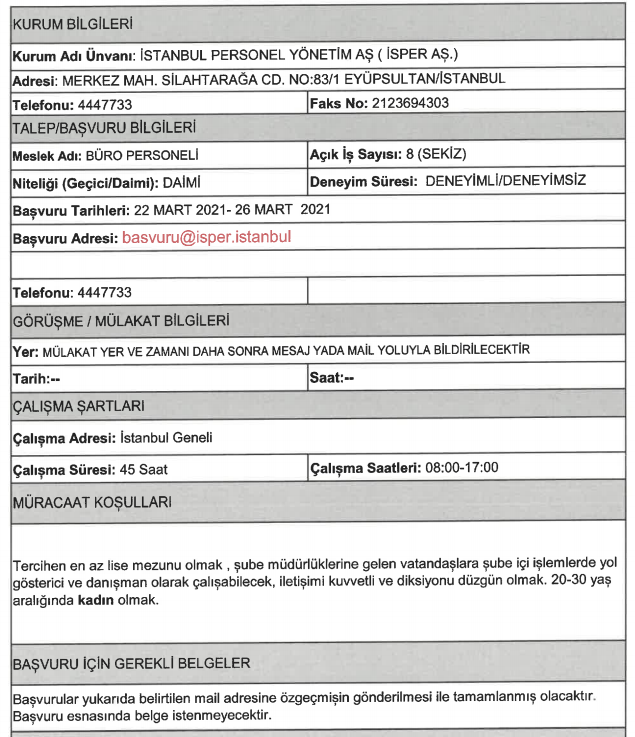 İŞKUR üzerinden art arda duyurular yayımlandı ve İSPER bünyesine en az likokul mezunu olan adaylar arasından personel alımı yapılacağına yer verildi. İSPER bünyesine deneyimli ve deneyimsiz adaylar arasından yapılacan alımda KPSS şartı aranmıyor.