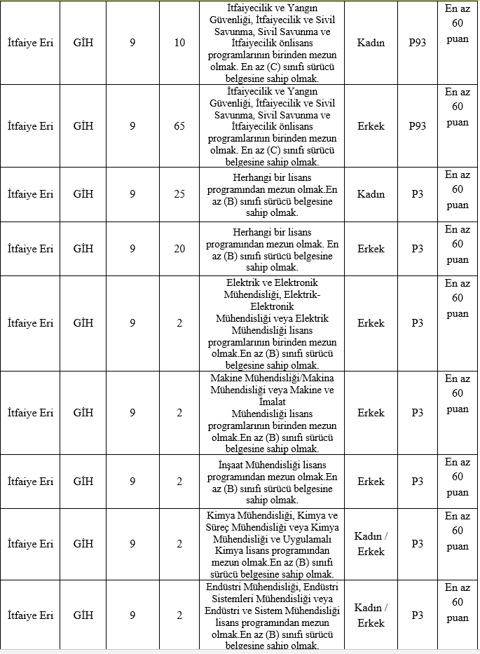 * İlan edilen İtfaiye Eri kadro unvanı için son olarak mezun olunan okul itibariyle öğrenim şartlarını taşımak ve bu öğrenimle ilgili olarak 2020 KPSS (B) grubu sınavına girmiş olmak ve ilgili puan türünden yukarıda tabloda belirtilen asgari puanı almış olmak.