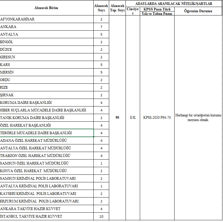 Emniyet Hizmetleri Sınıfı Dışında Görevli Kadrolu ve Sözleşmeli Personel Yönetmeliği çerçevesinde, 657 sayılı Devlet Memurları Kanunu kapsamında değişik illerde görevlendirilmek üzere merkez ve taşra teşkilatına Kadrolu olarak yapılacak hizmetli alımında 90 kamu personeli istihdam edileceğine yer verildi. Kadın ve erkek adaylar arasından birçok şehirdeki EGM birimlerinde istihdam edilecek personeller , Sınav Komisyonunca yapılacak sözlü ve/veya uygulamalı sınav sonucuna göre alınacak.
