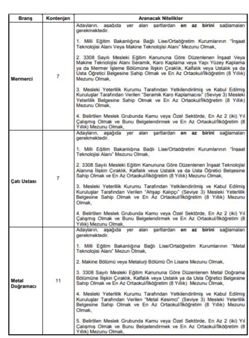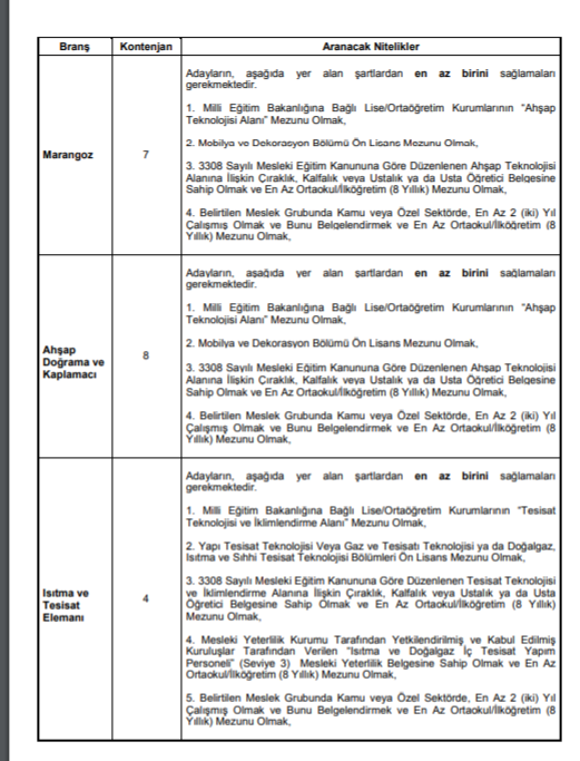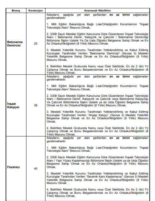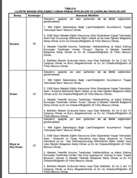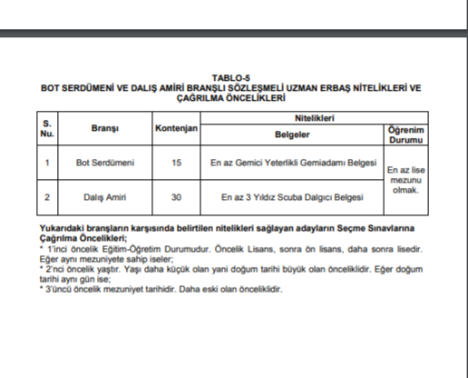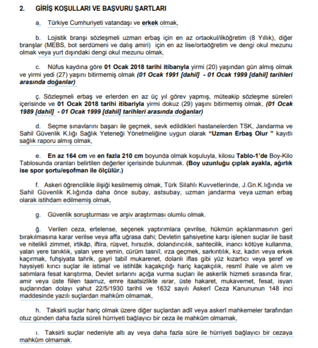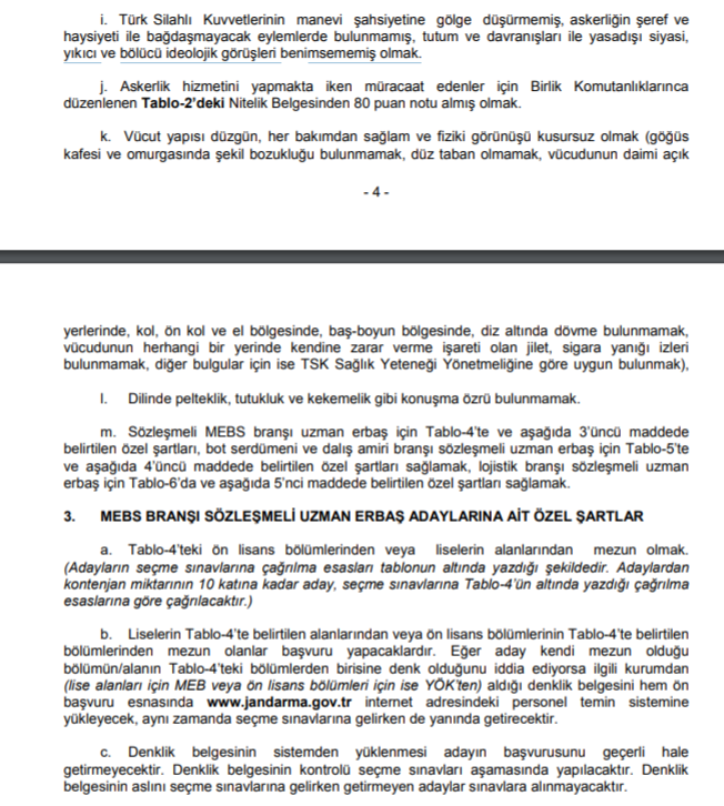Jandarma Genel Komutanlığı 1997'si Muharebe Elektronik ve Bilgi Sistemleri, 333'ü Lojistik, 15'i Bot Serdümeni ve 30'u dalış amiri olmak üzere 2 bin 375 sözleşmeli uzman erbaş alımı yapacak. Başvuru yapacak adaylarda askerliğini yapmış olma şartı aranmayacak, hali hazırda askerliğini yapanlar da ilgili alıma başvuru yapabilecekler.