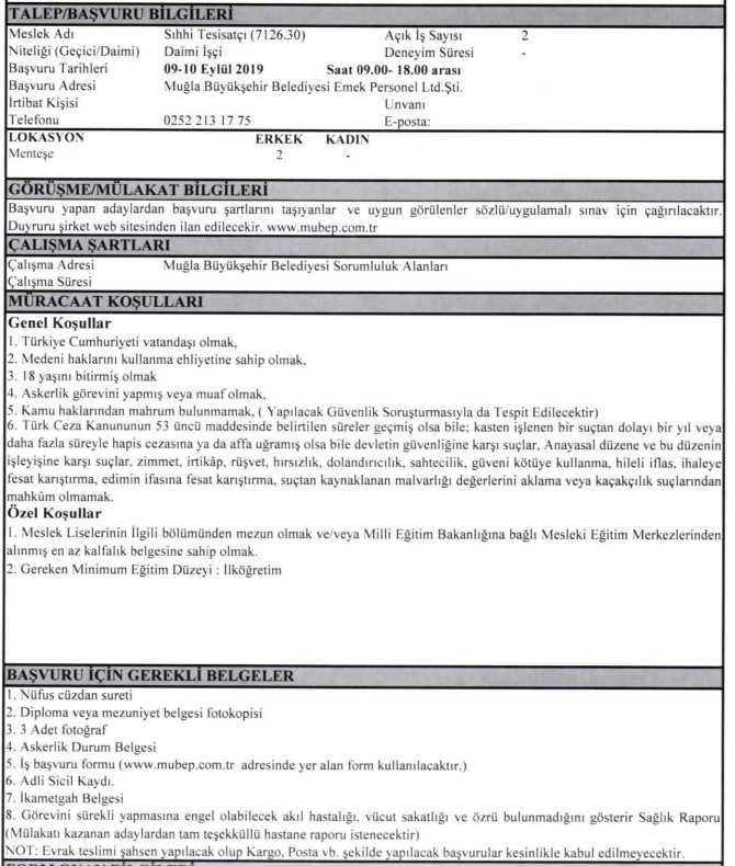 Belediyeler ve belediyelere bağlı kamu şirketlerine en az ilkokul mezunu adaylar arasından yapılan personel alımında adaylardan KPSS şartı aranmamaktadır. Büro işçisi, sekreter, şoför, güvenlik görevlisi ve işçi kadrolarında çalıştırmak üzere yapılan personel alımında başvuru genel şartları şu şekilde;