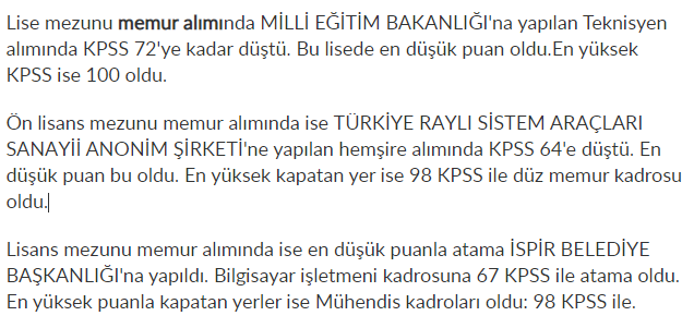 Lise, ön lisans ve lisans kadrolar için taban puanlar şu şekilde:
