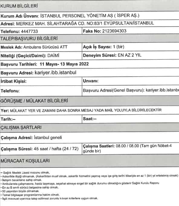 İBB´nin İŞKUR üzerinden yayımladığı ilanda kendi bünyesinde istihdam edilmek üzere 50 yaşından küçük 1 adet ambulans şoförü alımı yapacağını açıkladı.