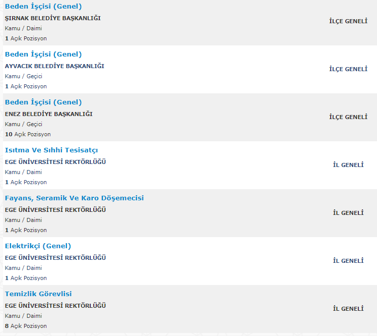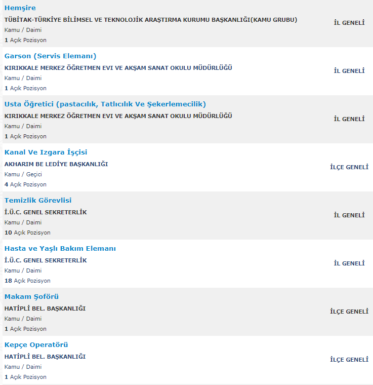 Türkiye İş Kurumu resmi internet adresi üzeirnden art arda ilanlar yayımlandı. Yayımlanan ilanlarda farklı kamu kurumlarına en az ilkokul mezunu adaylar arasından personel alımı yapılacağına yer verildi. KPSS şartı olmadan yapılan personel alımında adaylar kamu kurum ve kuruluşları bünyesinde istihdam edilecek.