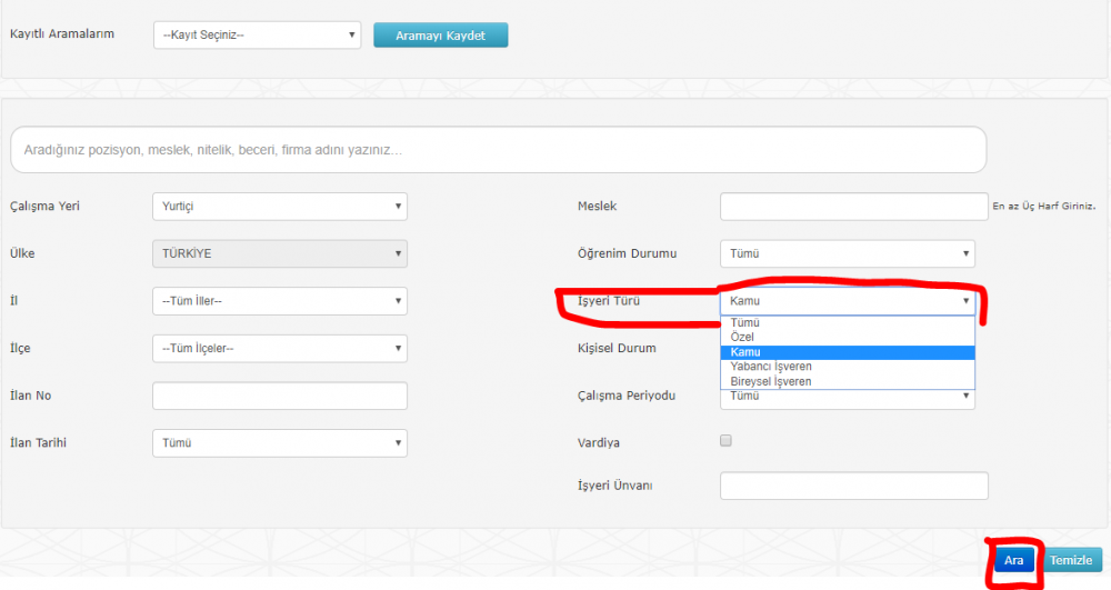 Bu ekranda işyeri türü yazan kısımda KAMU seçeneğini işaretleyin ve ARA butonuna tıklayın.