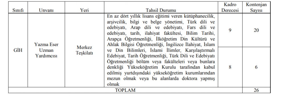 Kültür ve Turizm Bakanlığı'na memur alımı için başvuru süreci 30 Ocak'ta başlıyor. Adayların; Kütüphanecilik, arşivcilik, bilgi ve belge yönetimi, Türk dili ve edebiyatı, Arap dili ve edebiyatı, Fars dili ve edebiyatı, tarih, ilahiyat fakültesi, Bilim Tarihi, Arapça Öğretmenliği, İlköğretim Din Kültürü ve Ahlak Bilgisi Öğretmenliği, İngilizce İlahiyat, İslam ve Din Bilimleri, İslami İlimler, Karşılaştırmalı Edebiyat, Sosyoloji, Tarih Öğretmenliği, Türk Dili ve Edebiyatı Öğretmenliği bölümlerinden
