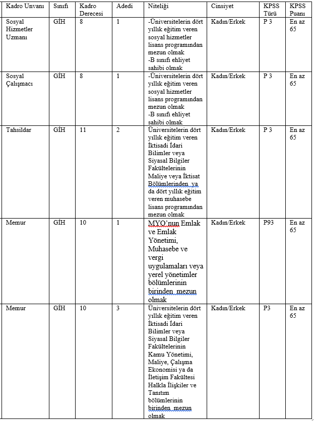 "Lüleburgaz Belediye Başkanlığı bünyesinde, 657 sayılı Devlet Memurları Kanunu’na tabi olarak istihdam edilmek üzere; Mahalli İdarelere İlk Defa Atanacaklara Dair Sınav ve Atama Yönetmeliği hükümlerine göre aşağıda unvanı, sınıfı, derecesi, adedi, nitelikleri, KPSS puan türü, KPSS taban puanı ve diğer şartları taşımak kaydıyla, belirtilen boş kadrolara açıktan atama yoluyla memur alınacaktır." ifadeleri ile yayımlanan kamu personeli alımı ilanında başvuruya dair bilgiler ve detaylara şu şekilde yer verildi: