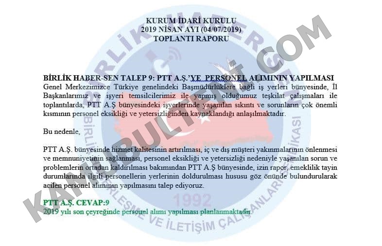 Birlik Haber Sen 'in sorusuna PTT şu şekilde cevap verdi: