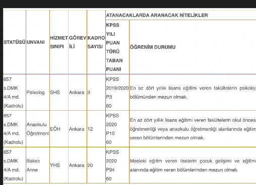 Psikolog, Anaokulu Öğretmeni ve Bakıcı Anne unvanlarında gerçekleşecek alımlara başvuru yapmak isteyen adaylarda aranacak özel şartlar ise şu şekilde: