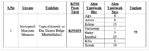 Ticaret Bakanlığı’na Ağrı, Artvin, Edirne, Gaziantep, Hatay, İstanbul, Kilis ve Şırnak illerinde görevlendirilmek üzere toplamda 75 sözleşmeli muayene memuru alımı yapılacak. İlgili alıma başvuru yapmak isteyen adayların KPSS’ye girmiş olması ve mezuniyet ile diğer şartları da yerine getirmesi gerektiği kaydedildi.
