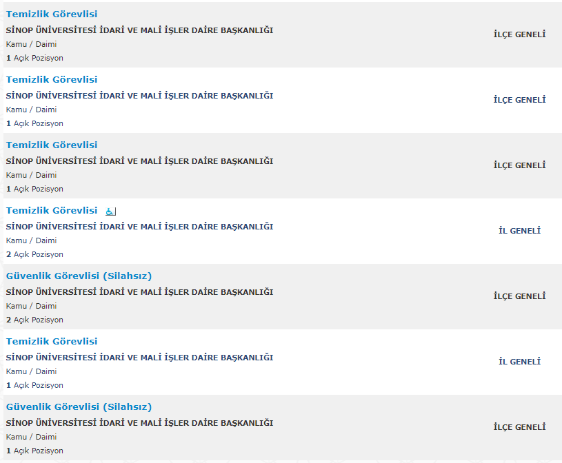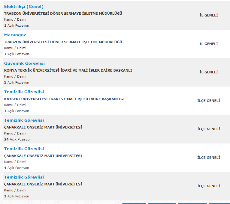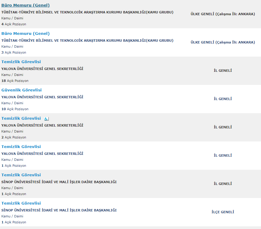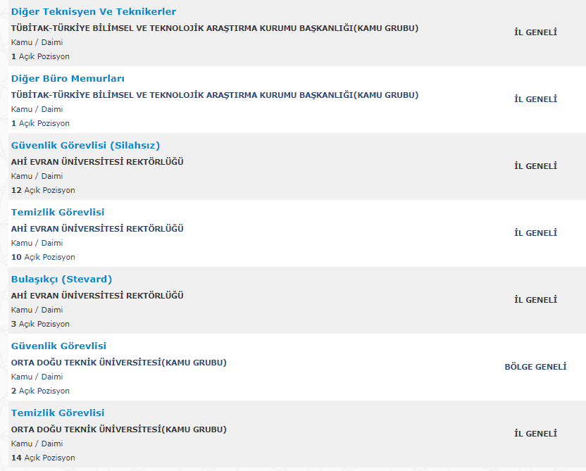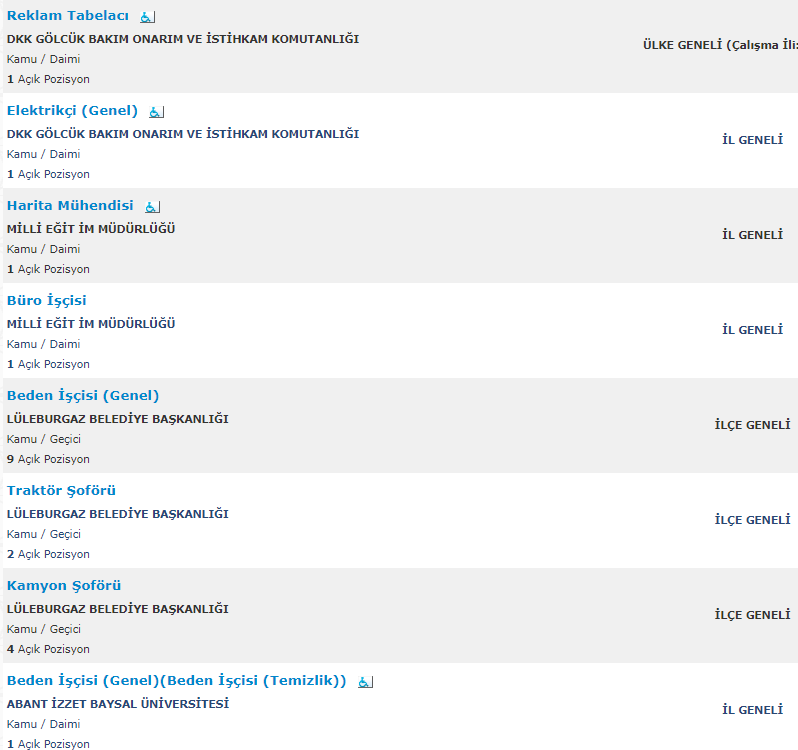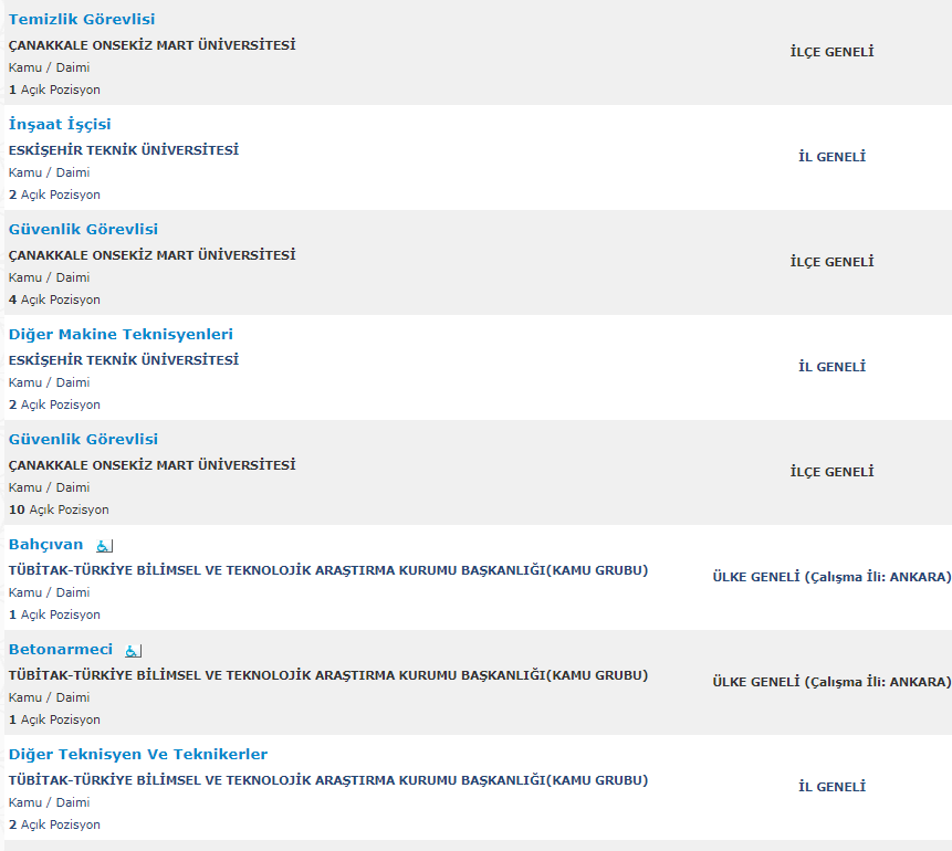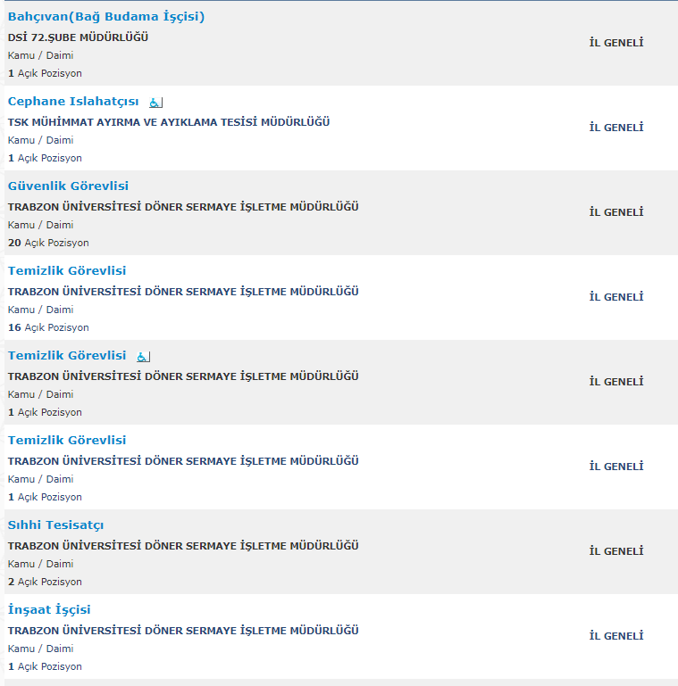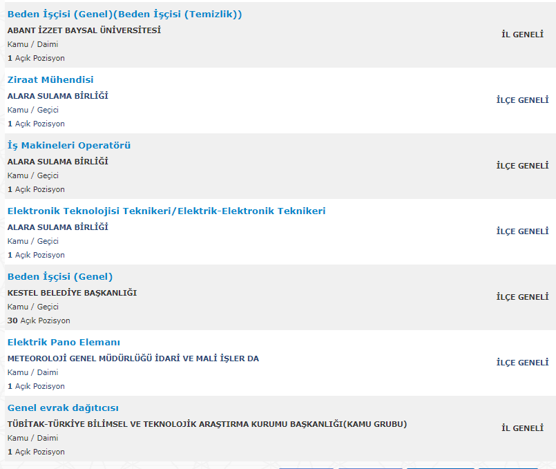 Türkiye İş Kurumu resmi internet adresi üzerinden yayımlanan duyurularda , mezuniyet şartı olmadan ve en az ilkokul mezunu adaylar arasından personel alımı yapılacağına yer verildi. Toplamda 261 kamu personeli ve kamu işçisi alımı için yayımlanan duyurular , başvuru bilgileri ve başvuru ekranı haberimizde.