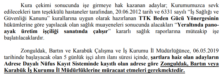 - Zonguldak 350 işçi alımı için; 23 Mayıs 2019 tarihinde, Zonguldak Site (Bahçelievler) kapalı Spor salonunda yapılacak.