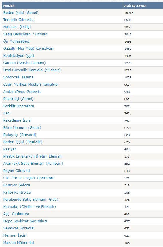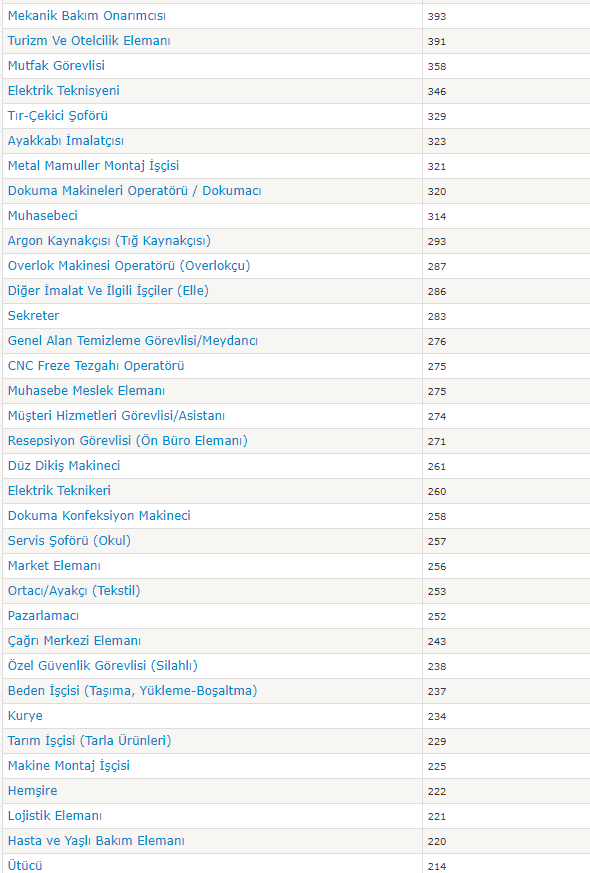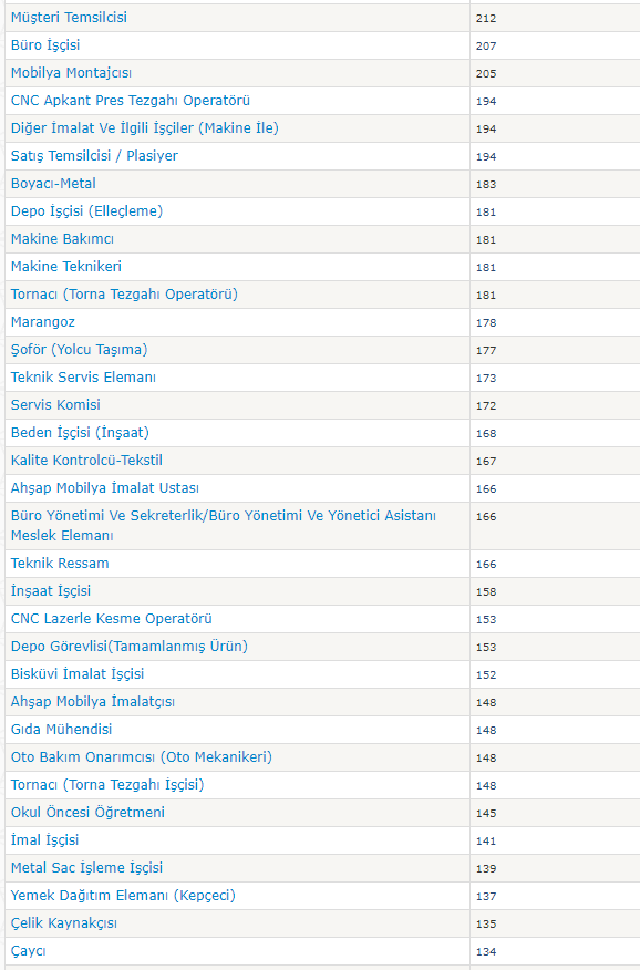 En fazla alım 18 bin 915 kişiyle beden işçisi alımı olarak öne çıkıyor. Daha sonra 3 bin 538 kişiyle temizlik işçisi alımı gelirken onu 2 bin 55 personel ile Makineci(dikiş) takip ediyor. Özel güvenlik görevlisi alımına ise 1.225 kişiyle silahsız, 238 kişiyle silahlı olmak üzere 1.463 kadro ayrılmış durumda. Bununla beraber Türkiye geneli şoför alımı için ise 1028 personel ihtiyacı bulunuyor. Alımı yüksek olan diğer kadrolar şu şekilde;