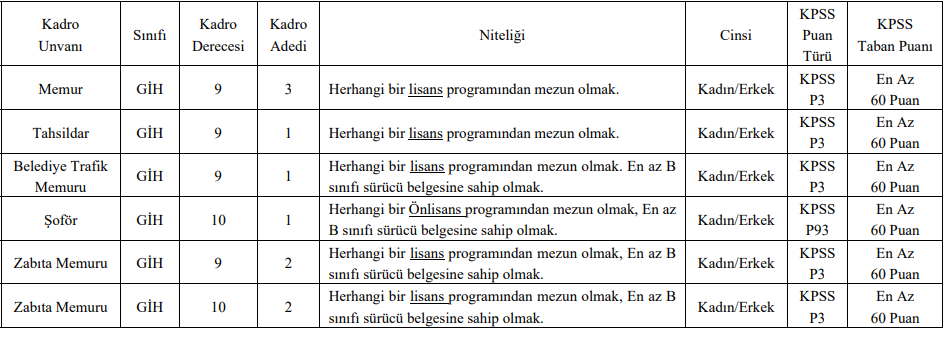 - Zabıta Memuru ve Şoför kadrosuna başvuracaklar için; 13.10.1983 Tarihli ve 2918 sayılı Karayolları Trafik Kanunu hükümlerince verilen en az B sınıfı sürücü belgesine sahip olmak.