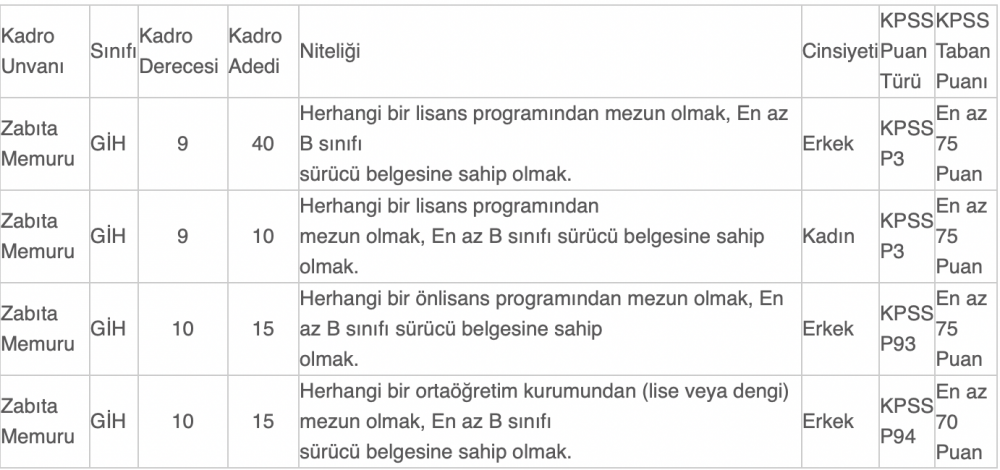 a) İlan edilen zabıta memuru kadroları için mezun olunan okul itibarıyla öğrenim şartını taşımak ve bu öğrenimle ilgili olarak 2020 yılı Kamu Personel Seçme Sınavından (KPSS) alım yapılacak kadroların karşısındaki puan türlerinden, belirtilen asgari KPSS puanını almış olmak.