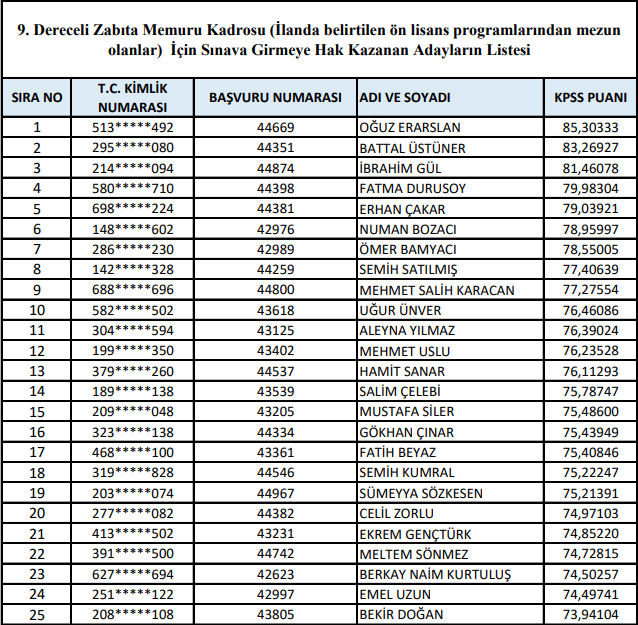 571 kişi başvuru yapmış, bunlardan 114 kişinin düz lise, 6 kişinin 2018 yılı KPSS puanın 60 puanın altında olması,1 kişinin bir alt öğrenimden sınava girmiş olması, 9 kişinin 30 yaş üzeri olması, 40 kişinin boy/kilo endeksinin uygun olmaması, 7 kişinin 2016 B grubu ortaöğretim sınavına girmiş olmaları sebebiyle “2016 KPSS Ortaöğretim / Ön Lisans Kılavuzu” 1.11’inci madde gereği başvuruları değerlendirmeye alınmamış, kalan 394 aday “Belediye Zabıta Yönetmeliğinin” 13/C maddesine istinaden 2018 yılı KPSS puanlarına göre sıralanarak en yüksek puanlı adaydan başlamak üzere boş kadro sayısının 5 katı (5X5=25 ) aday sözlü sınava çağrılmaya hak kazanmıştır.