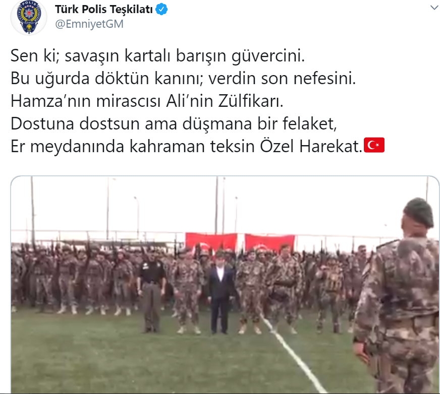 Türker, tarihi şan ve şerefle yazılan kahraman birimin mensupları olduklarına vurgu yaparak, Allah(C.C)'dan kahraman özel harekat polislerimizin yardımcısı olmasını dilediğini söyledi. Videoda, konuşmanın ardından yemin eden kahraman polis özel harekatçıların bölgeye uğurlanışı yer alırken, paylaşımda, "Sen ki savaşın kartalı, barışın güvercini, bu uğurda döktün kanını, verdin son nefesini, Hamza'nın mirasçısı, Ali'nin Zülfikarı, bir dostuna dostsun ama düşmana bir felaket, er meydanında kahraman teksin özel harekat." ifadelerinin yer aldığı görüldü.