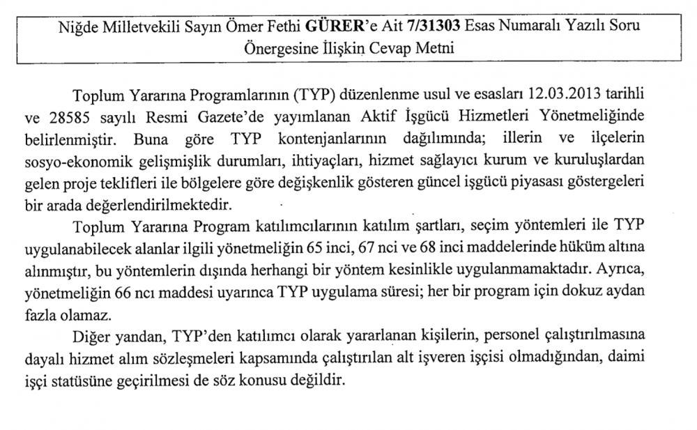Bakan Selçuk verdiği cevapta , TYP 'den katılımcı olarak yararlanan işçilerin personel çalıştırmasına dayalı hizmet alım sözleşmeleri kapsamında çalıştırılan alt işveren işçisi olmadığı için kadroya geçirilmelerinin söz konusu olmadığına , kadro çalışmasının olmadığına yer verildi.
