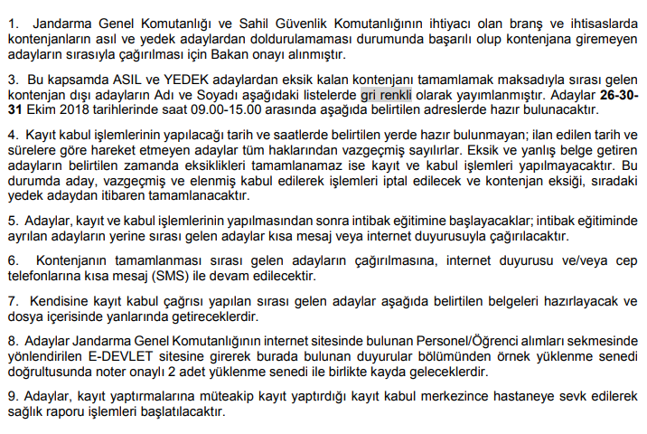 Yayımlanan duyuruda aşağıdaki isimleri yazan yedek adayların 26-30- 31 Ekim 2018 tarihlerinde 09.00-15.00 arasında (Ankara için 09.00- 13.00 arası) hazır olmaları gerekmektedir.
