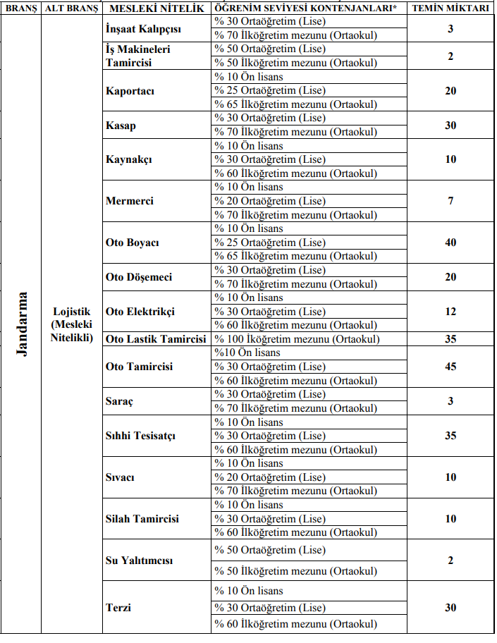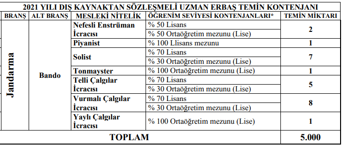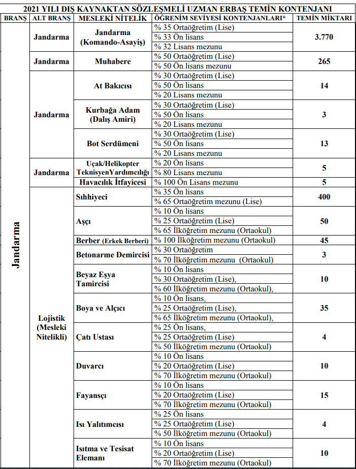 Jandarma Genel Komutanlığı 2021 yılı sözleşmeli uzman erbaş alımı başvurusu geçen Ocak yaında alındı. Ocak ayının ortasında yayımlanan ilanda, aşağıdaki branşlarda istihdam etmek üzere 5 bin sözleşmeli uzman erbaş alımı yapılacağına yer verildi: